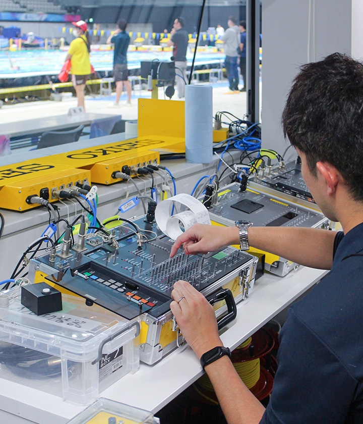 現在は、競泳・カヌー、オープンウォーターなどの競技で、公式のタイム計測をしています。テレビで見るような華やかなスポーツイベントを、縁の下から支える仕事です。土まみれになりながら機材を運んだり、茂みの中でケーブルを敷いたりと、地味で泥臭い作業の連続です。