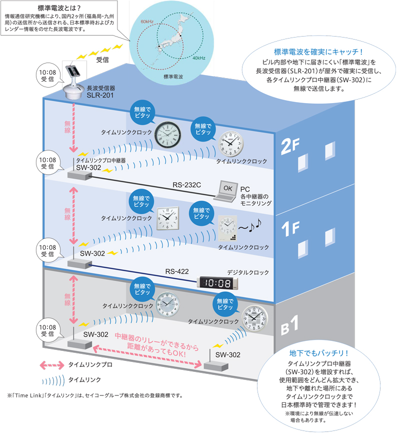 完全無線中継は、施設内の配線を不要にするもので、セイコータイムクリエーションの独自技術だ。