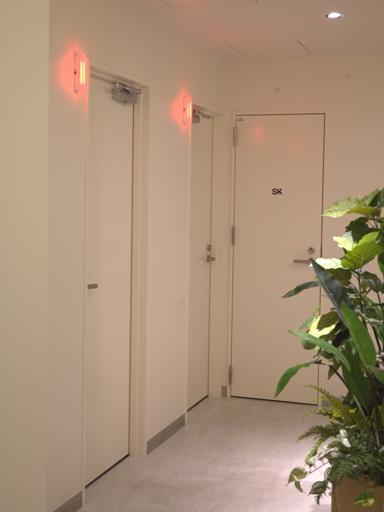 特に車椅子ユーザーの方は健常者よりも個室の使用時間が長くなるため、個室が使用中であれば順番待ちをせず、別のトイレを探すそうです。そのため、遠くから見てもすぐに利用状況が分かるようにしました。「食堂に入った瞬間に、空いているか、そうではないかが分かる仕組み」を最優先でリクエストしたものです。