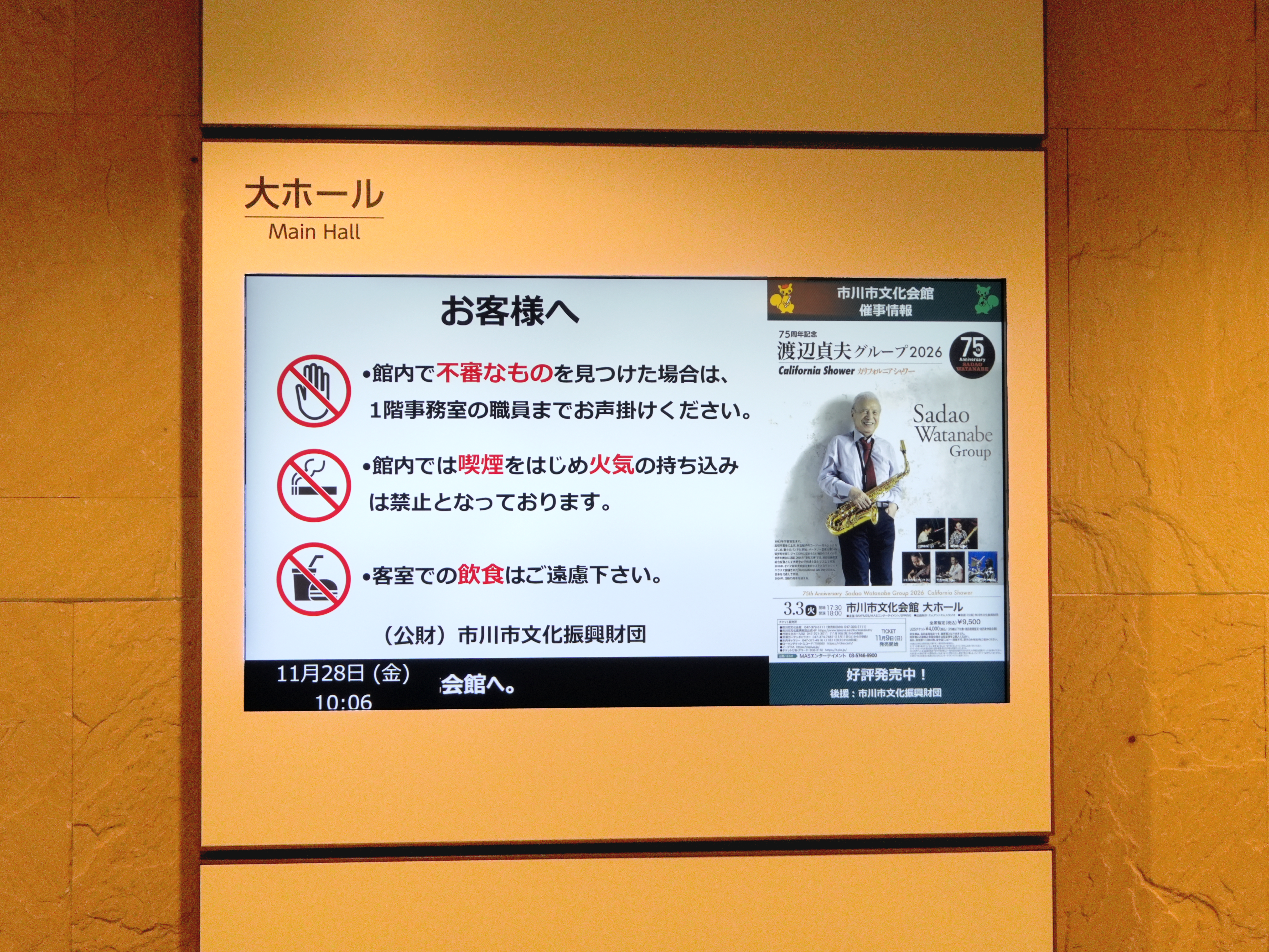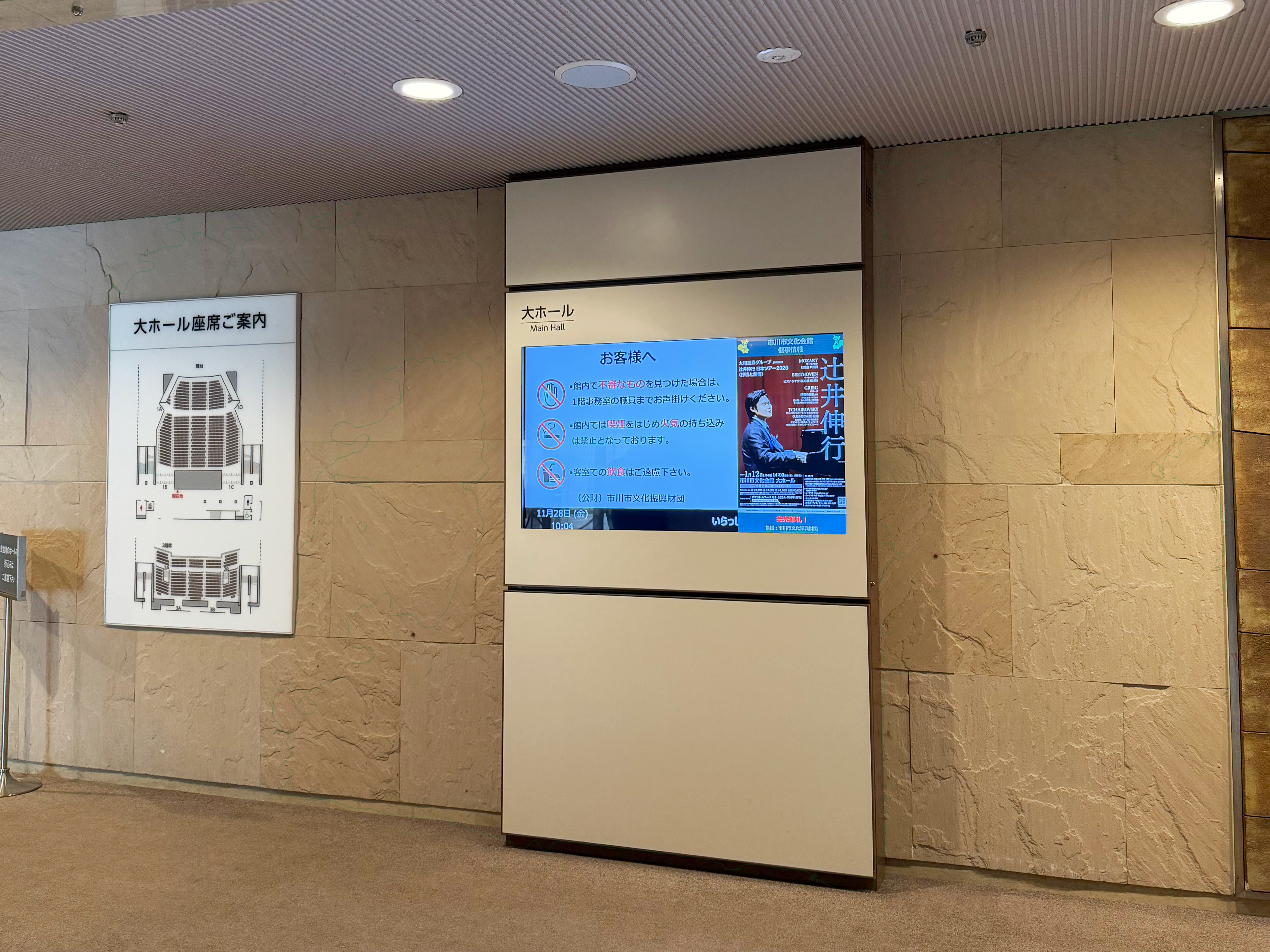 市川市文化会館は、大・小のホールをはじめ、展示室、会議室、練習室、和室、茶華道室などを備えた芸術文化の拠点です。それぞれのホール前にデジタルサイネージが導入されており、来館者の方へ、公演やイベントなどの催事情報・館内の注意事項・ホール内のライブ映像などを表示しています。