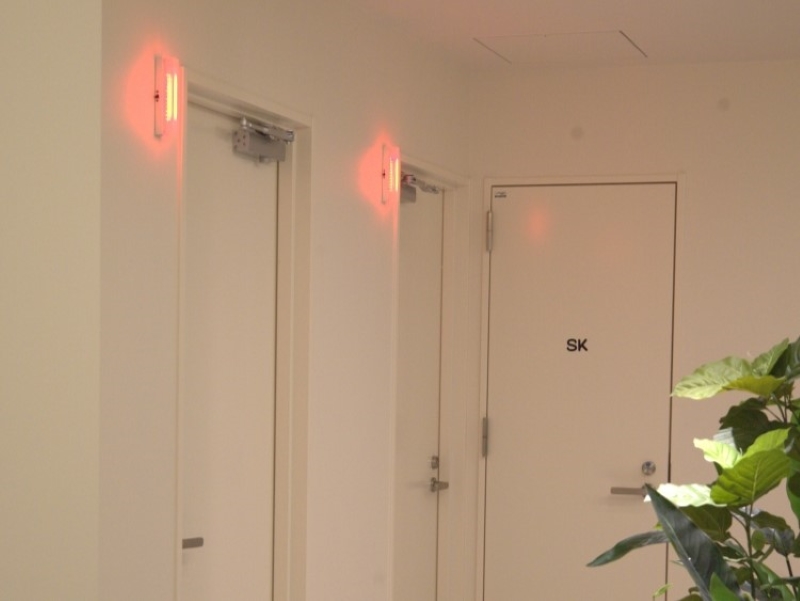 満室、空室を3つのパターンで表示しています。まず、食堂の入り口からすぐに見える場所に「空室があるかないか」が分かる表示灯を設置しています。また、手洗い場の壁面にプロジェクターで各個室の利用状況を投影し、トイレ空間に入る前に個室の状況が分かるようになっています。さらに、各個室の扉にも表示灯を付け、トイレの前で空室か利用中か確認できます。