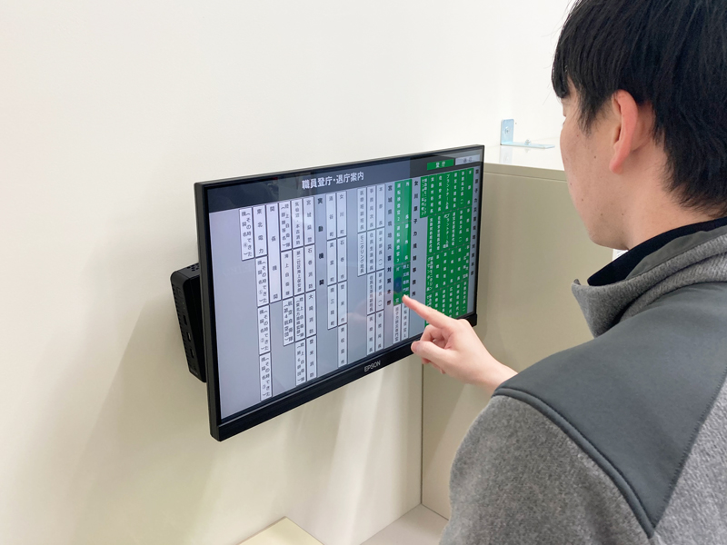 牡鹿郡女川町のオフサイトセンターに、タッチパネル式と表示式の出退システムを導入。オフサイトセンター1階ホールに設置されたタッチパネルを操作することで、登退庁状況を変更できるようになっています。・22インチディスプレイ(タッチ式)×1台・40インチディスプレイ×3台